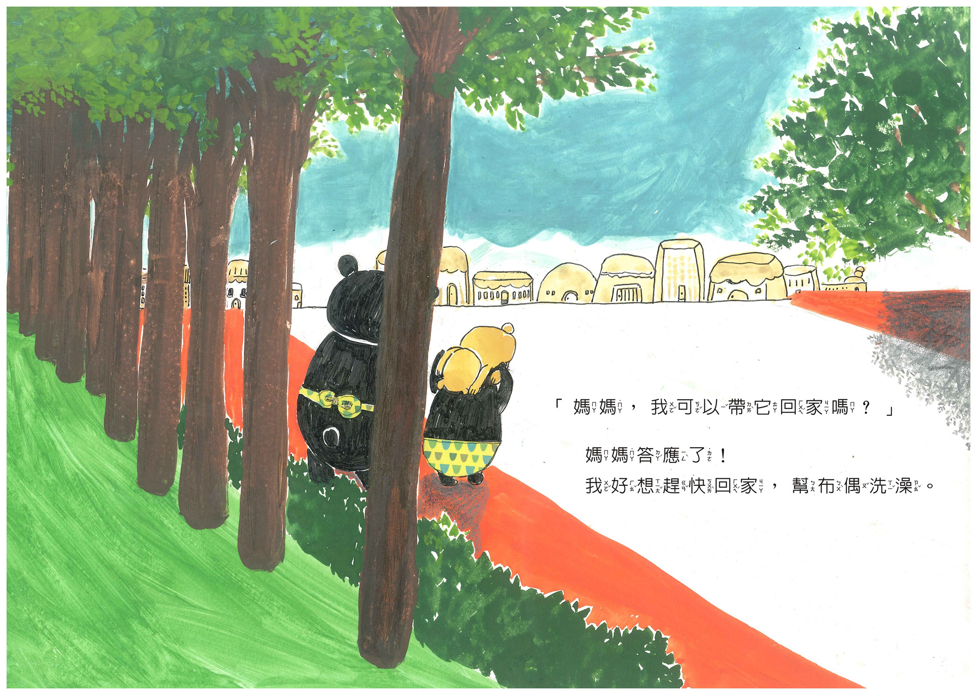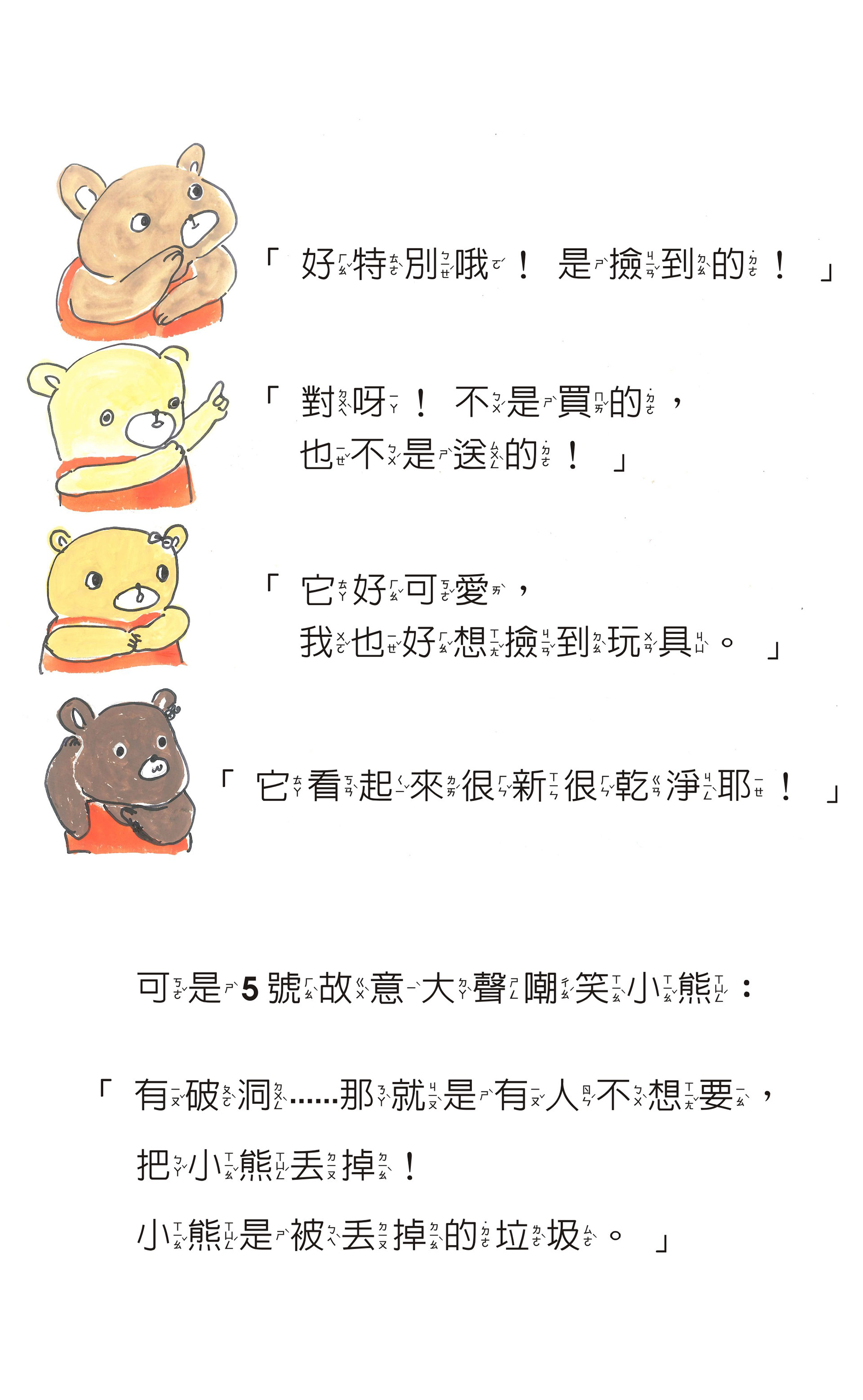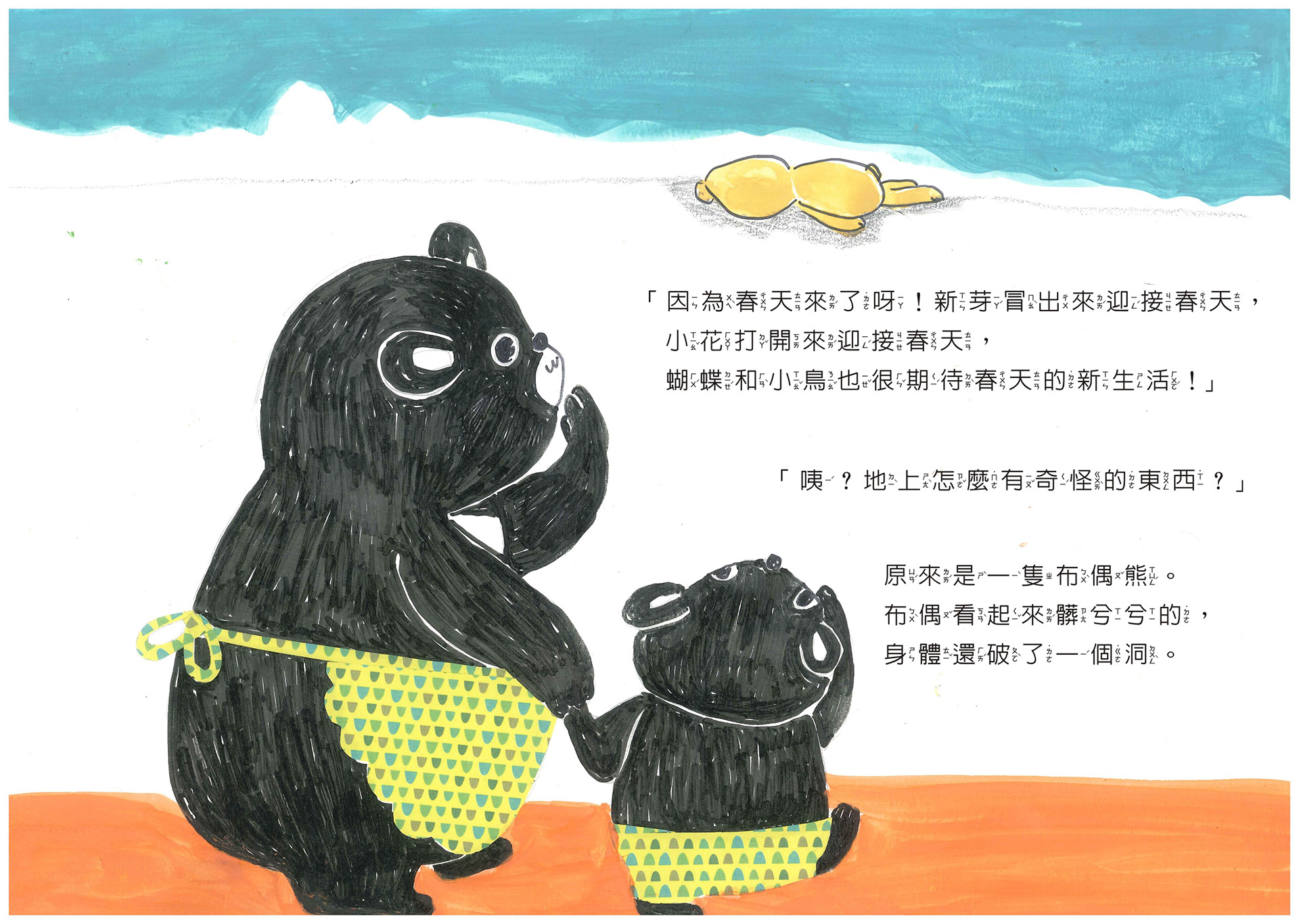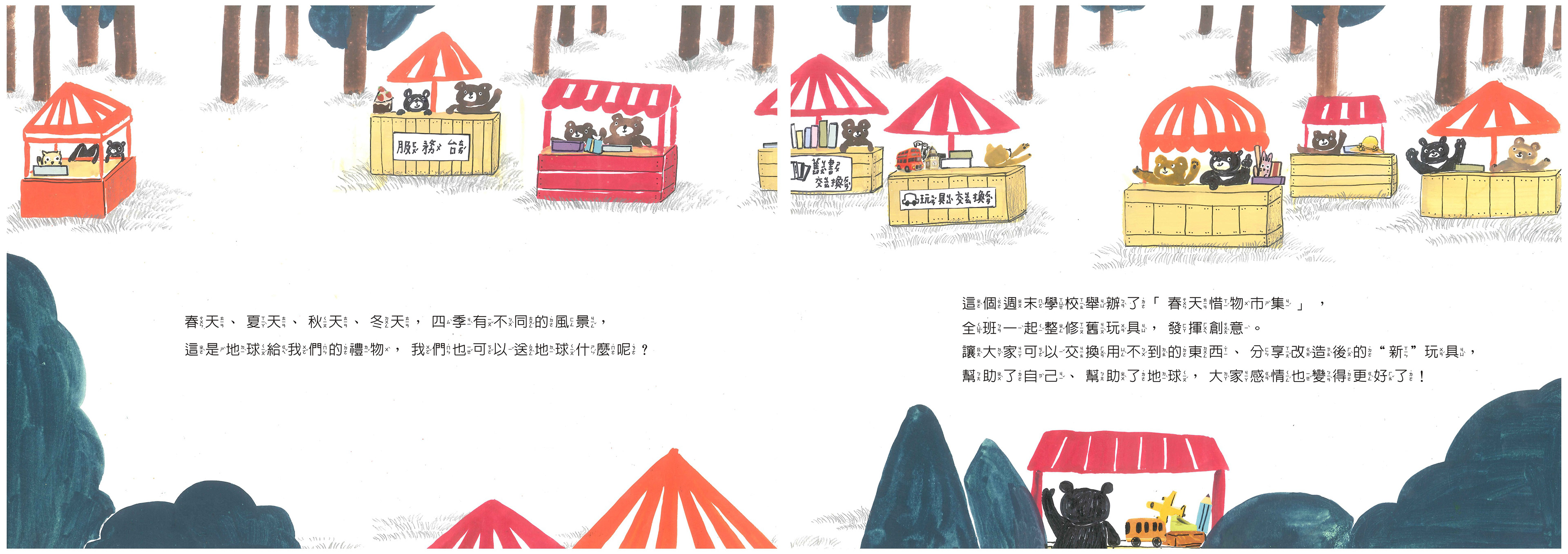 文/圖 林毓容 有天路邊,我和孩子爸看到一隻路倒的破洞熊, 於是帶回家,告訴女兒大熊先讓太陽曬暖暖後送她, 兒子竊笑:「詠詠,那是爸爸媽媽撿來的~哦!」 跟孩子們討論熊明明很新、很完整, 只是因為破洞就被丟棄了,是不是很可惜? 兒子認同,女兒說:「沒關係,我喜歡!」 於是女兒睡覺多了一個大娃娃。 女兒每天一定要靠著拉拉睡,直到現在。 我用繪本記錄真實生活,也希望傳遞「珍惜」的心。 #珍惜後也想給予,那就是最棒的結果了。 「春天、夏天、秋天、冬天,四季有不同的風景, 這是地球給我們的禮物。 我們,也可以送地球什麼呢?」